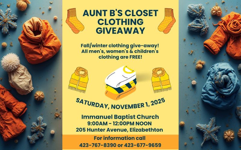 HomeEventsAunt B’s Closet Clothing Giveaway Aunt B’s Closet Clothing Giveaway SHARE NOW Sat, Nov 1 from 9:00am to 12:00pm Immanuel Baptist Church205 Hunter Avenue, Elizabethton TN Map Add to My Calendar