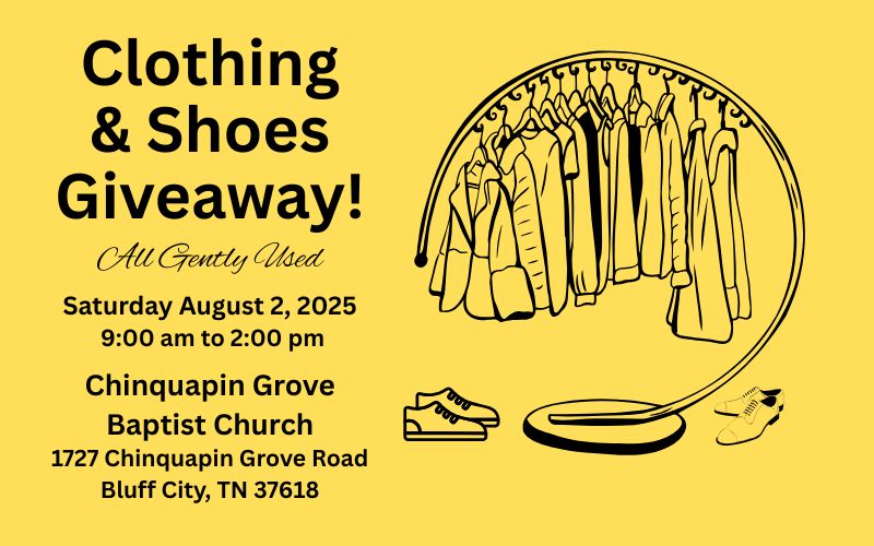 HomeEventsClothing & Shoes Giveaway at Chinquapin Grove Baptist Church Clothing & Shoes Giveaway at Chinquapin Grove Baptist Church SHARE NOW Sat, Aug 2 from 9:00am to 2:00pm Chinquapin Grove Baptist Church1727 Chinquapin Grove Road, Bluff City, TN Map Add to My Calendar