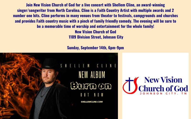 Join New Vision Church of God for a live concert with Shellem Cline, an award-winning singer/songwriter from North Carolina. Cline is a Faith Country Artist with multiple awards and 2 number one hits. Cline performs in many venues from theater to festivals, campgrounds and churches and provides Faith country music with a pinch of family friendly comedy. The evening will be sure to be a memorable time of worship and entertainment for the whole family!