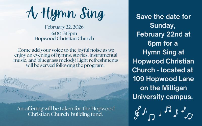 Save the date for Sunday, February 22, 2026 at 6pm for a Hymn Sing at Hopwood Christian Church – located at 109 Hopwood Lane on the Milligan University campus. ![]()