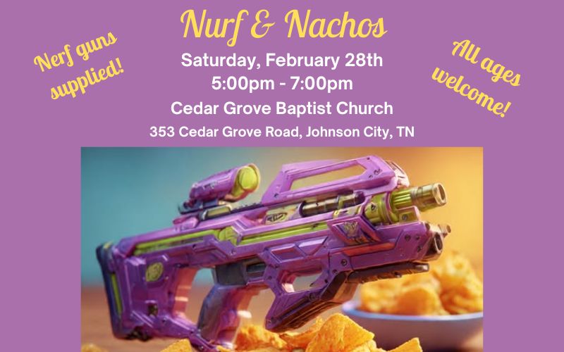 HomeEventsNurf & Nachos Nurf & Nachos SHARE NOW Sat, Feb 28 from 5:00pm to 7:00pm Cedar Grove Baptist Church353 Cedar Grove Road, Johnson City, TN Map Add to My Calendar