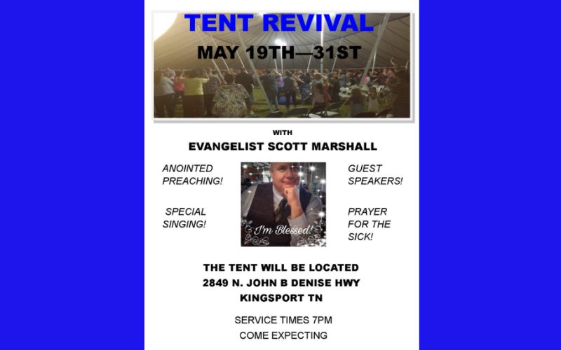 HomeEventsTent Revival Tent Revival SHARE NOW Mon, May 19 at 7:00pm - Sat, May 31 at 7:00pm 2849 N John B Dennis Hwy, Kingsport, TN Map Add to My Calendar