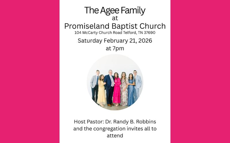 HomeEventsThe Agee Family at Promiseland Baptist Church The Agee Family at Promiseland Baptist Church SHARE NOW Sat, Feb 21 from 7:00pm to 9:00pm Promiseland Baptist Church104 McCarty Church Road, Telford TN Map Add to My Calendar