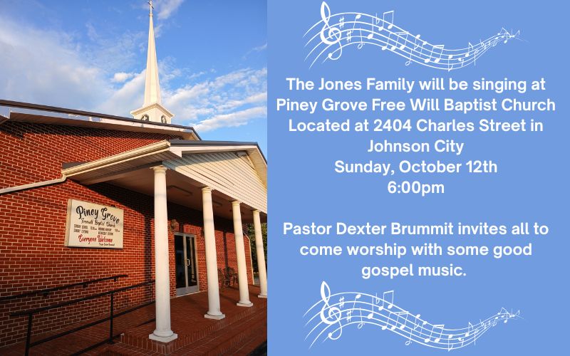 HomeEventsThe Jones Family singing at Piney Grove Free Will Baptist Church The Jones Family singing at Piney Grove Free Will Baptist Church SHARE NOW Sun, Oct 12 from 6:00pm to 8:30pm Piney Grave Free Will Baptist Church2404 Charles Street, Johnson City, TN Map Add to My Calendar