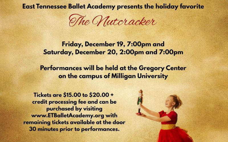 HomeEventsThe Nutcracker presented by East Tennessee Ballet AcademyThe Nutcracker presented by East Tennessee Ballet AcademySHARE NOW Sat, Dec 20 from 7:00pm to 9:00pm The Gregory Center on Milligan University Campus More Information: Website: https://www.etballetacademy.org/ Buy Tickets Add to My Calendar