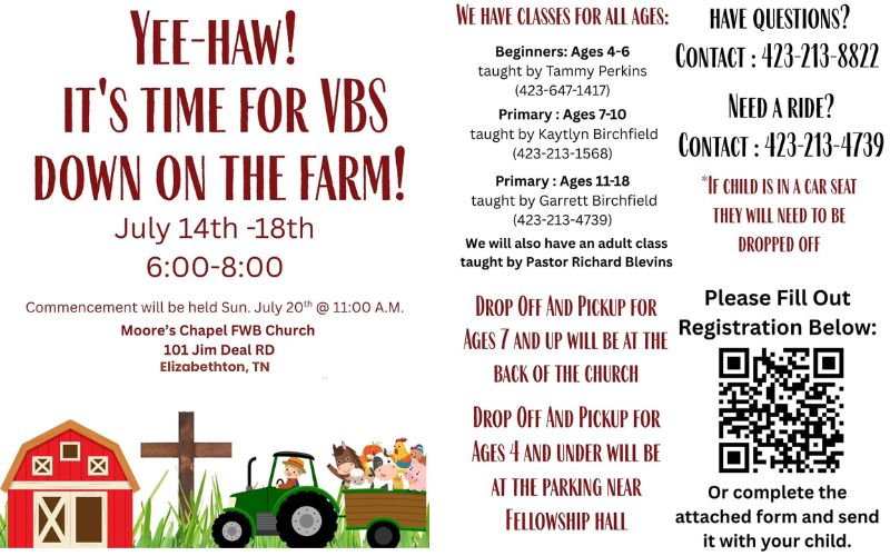 Join us for a fun-filled Vacation Bible School (VBS) at Moore’s Chapel FWB Church!