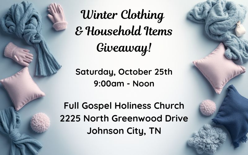 HomeEventsWinter Clothing & Household Item Giveaway Winter Clothing & Household Item Giveaway SHARE NOW Sat, Oct 25 from 9:00am to 12:00pm Full Gospel Holiness Church 2225 N Greenwood Drive, Johnson City, TN Map Add to My Calendar